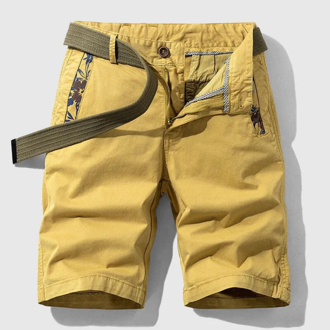 Make a statement with the Tim Zipper Fly Cotton Shorts—designed for men who value comfort and effortless style. These breathable cotton stretch shorts come with a statement belt and floral-print pocket lining, delivering casual summer flair with functional performance.
