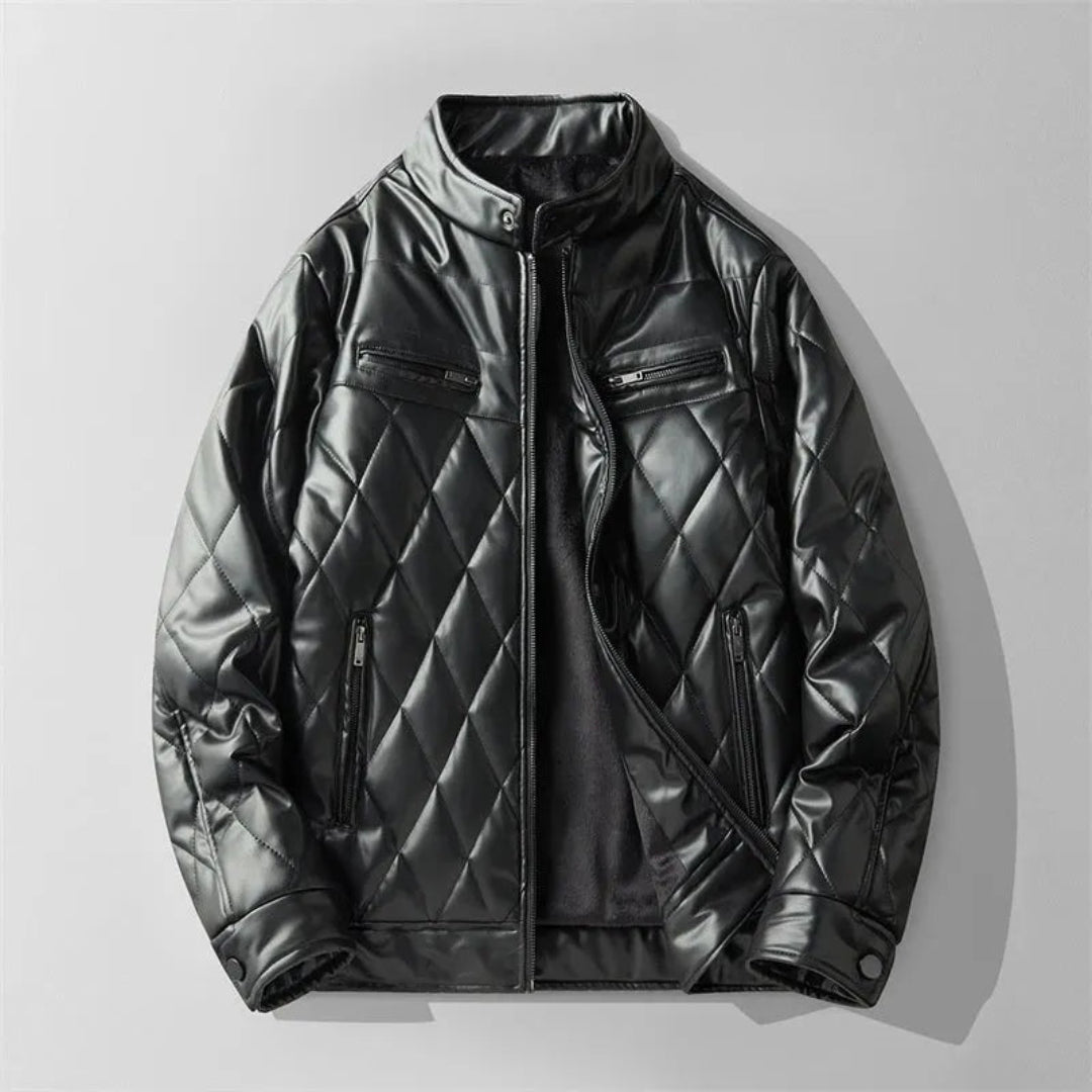 This leather jacket redefines modern sophistication with its structured diamond quilting and sleek stand-up collar. Crafted for those who value both edge and refinement, it brings together premium texture, bold lines, and everyday wearability.